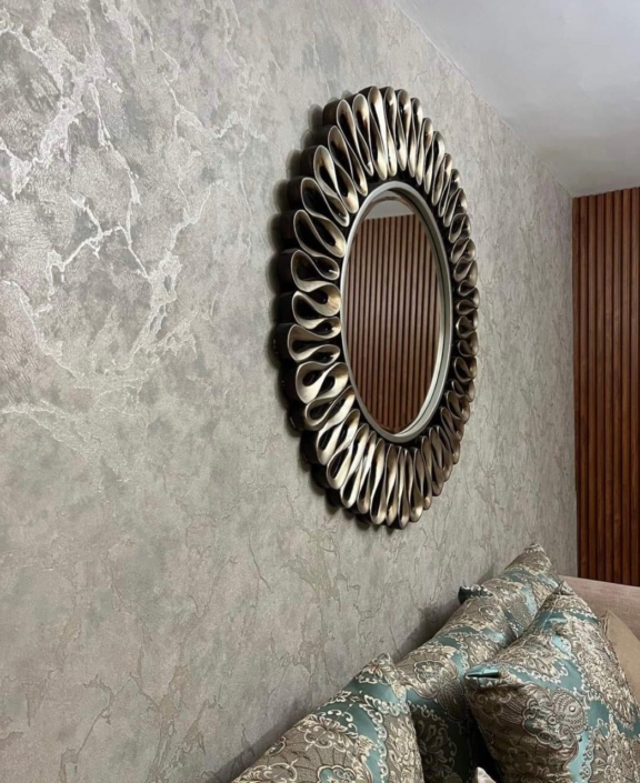 Texturas y relieves: aportan profundidad táctil al espacio. Desde acabados que simulan concreto, madera o piedra, hasta patrones geométricos tridimensionales que juegan con la luz del ambiente.